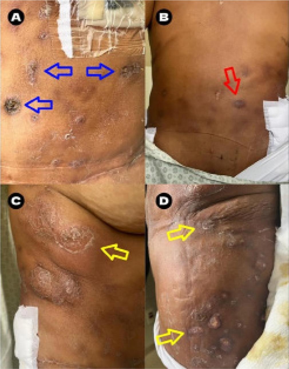 Figure 1. Clinical examination of lesions prior to treatment. (A) Multiple ulcer-crusted lesions in the abdomen, with areas of necrosis and necrotic crust (blue arrows), hyperemic borders with a diameter of 2-3 cm, and the presence of abdominal wall edema. (B) Diffuse hyperchromic nodular lesions (red arrows) on the back, trunk, and abdomen. (C) Subcutaneous abscessed lesions with hyperemia and desquamation around them (yellow arrows). (D) Posterior region of the thigh with edema and ulcer-crusted lesions with local purulent discharge (yellow arrows).