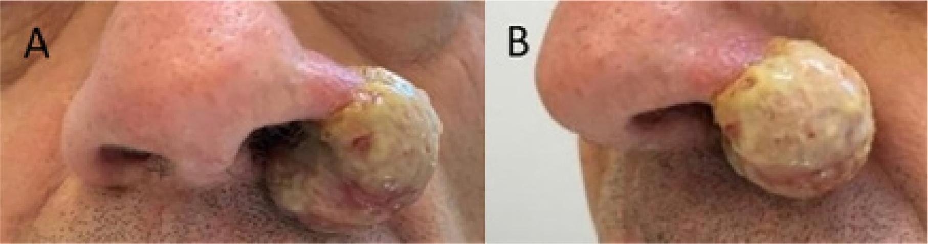 Figure 1. Hypertrophic lesion in the left nasal flap due to herpes simplex virus (A - frontal view; B - lateral view).