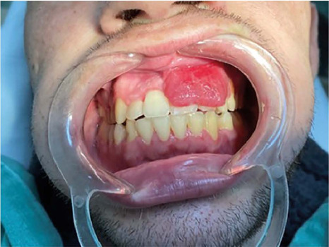 Two months after starting systemic chemotherapy against KS, the patient (already being followed up as an outpatient) complained of a single, nodular, raised, reddish oral lesion in the attached gum measuring 3 × 2 cm2, covering the dental crowns from the central incisor to the upper left canine (Figure 1), which was biopsied. Histological diagnosis was compatible with KS, and immunohistochemistry also confirmed the presence of HHV-8.